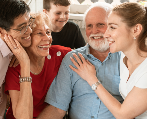 family members including a young married couple and their elementary aged daughter with grandparents smiling